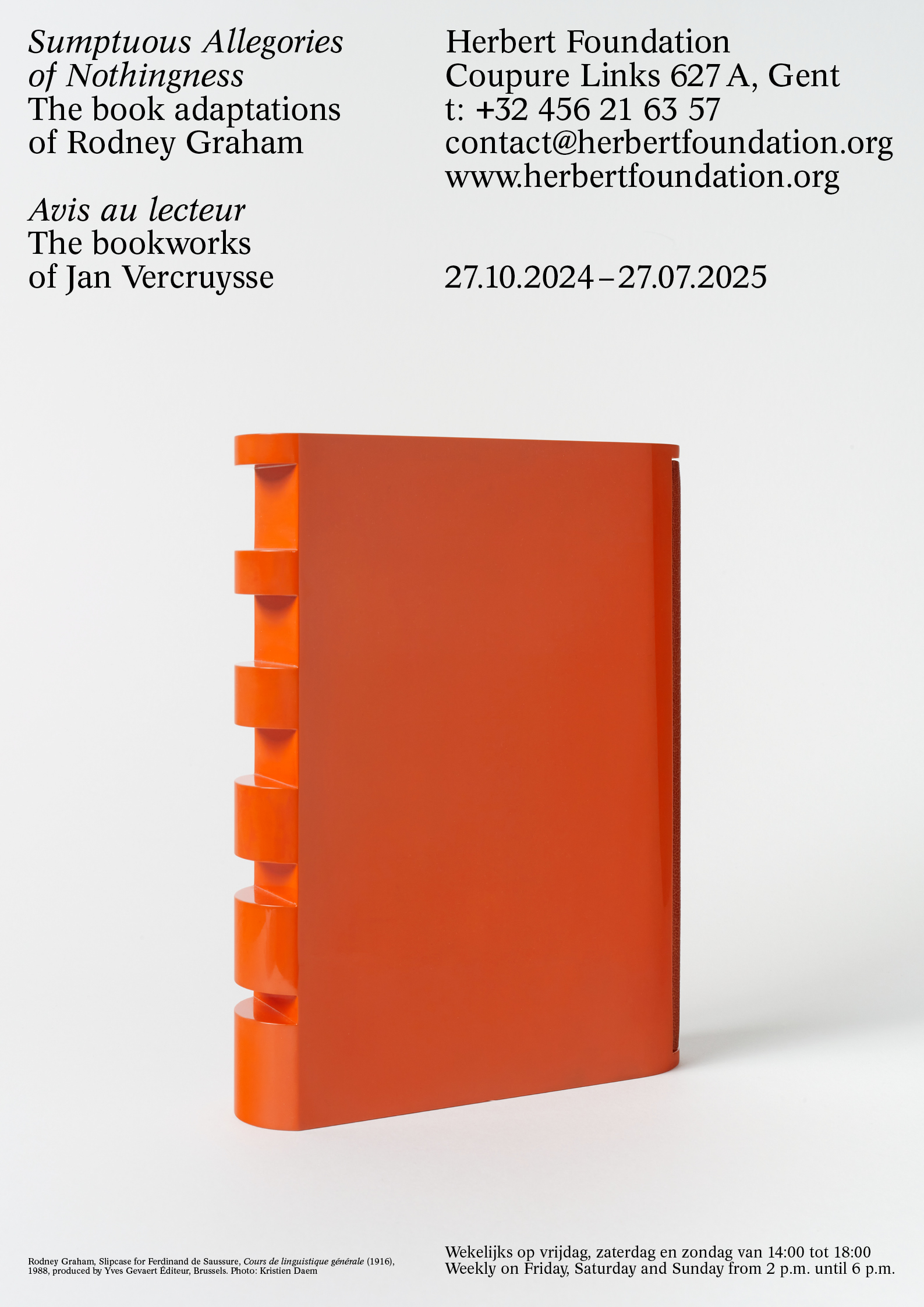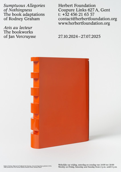 Poster announcing the exhibition ‘Sumptuous Allegories of Nothingness. The book adaptations of Rodney Graham / Avis au lecteur. The bookworks of Jan Vercruysse’ at the Herbert Foundation from 27 October 2024 to 27 July 2025.